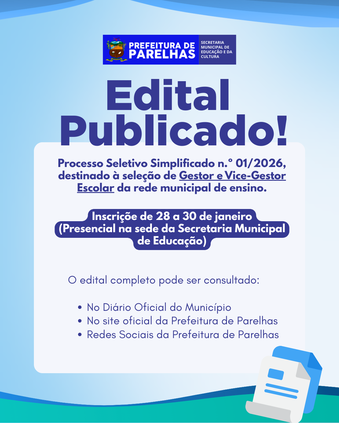 EDITAL ABERTO | PROCESSO SELETIVO SIMPLIFICADO Nº 01/2026 A Prefeitura de Parelhas, por meio da...